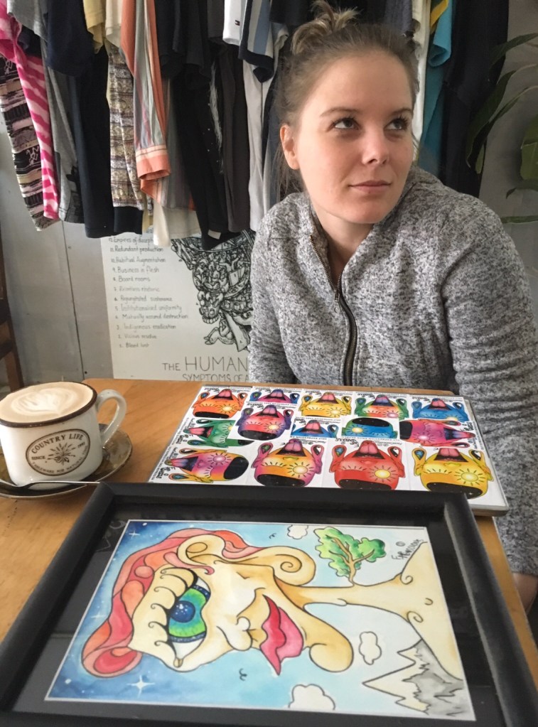 Woke up this morning to questions on my art…’I’ll take 3!’ Well that helps me get out of bed! Popped to my favorite coffee jam as usual and I watched my friend cover her laptop in my stickers, an additional layer to layers of stickers. She proclaims she never buys art, as a minimalist, so this is a big compliment, thank you! ‘When you make it big I want to say I have originals.’