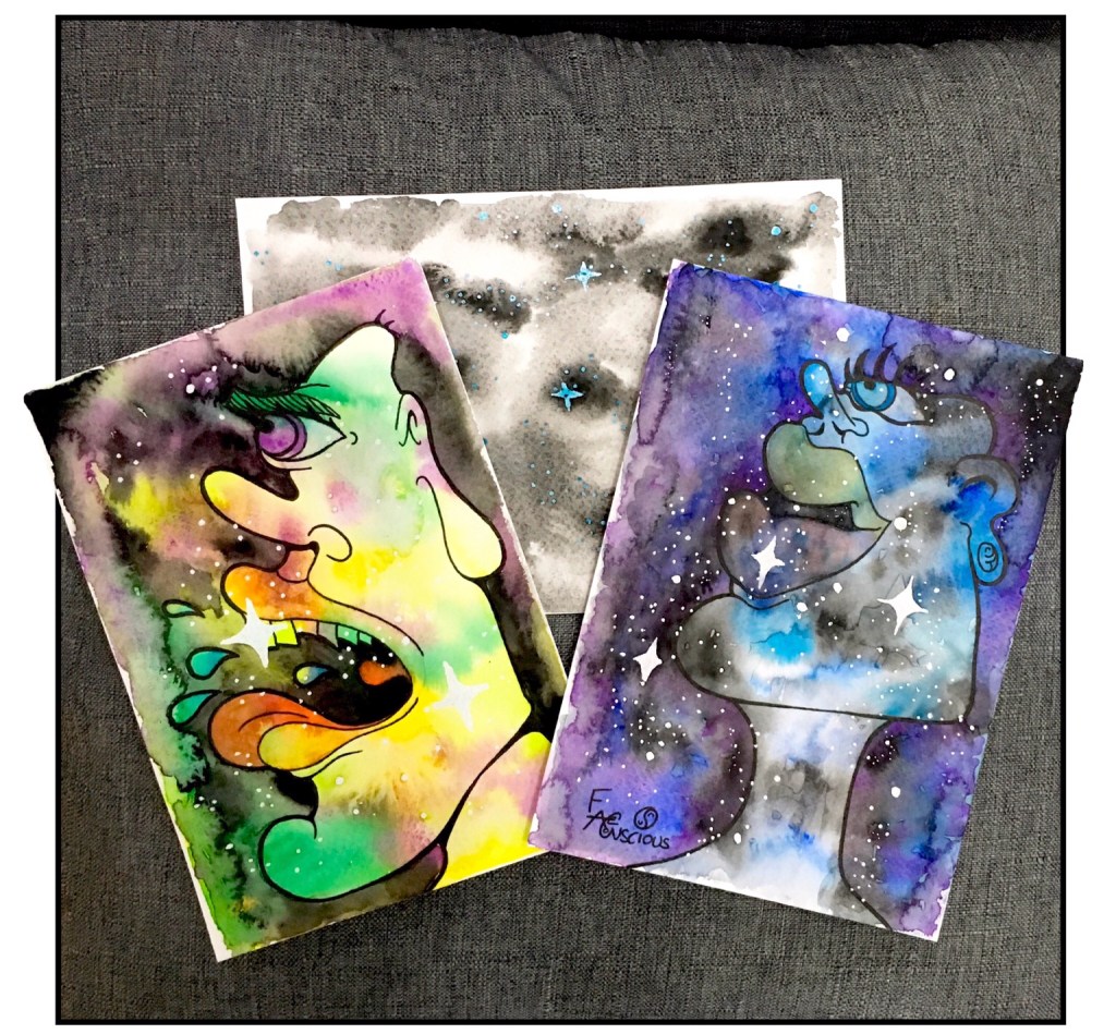 Playing around, I love space, and watercolour is such a fun medium for it. I love working with layers also. Here I’m putting down liquid latex for stars, water and pigmentation, followed by sketch and inking, painting some more…