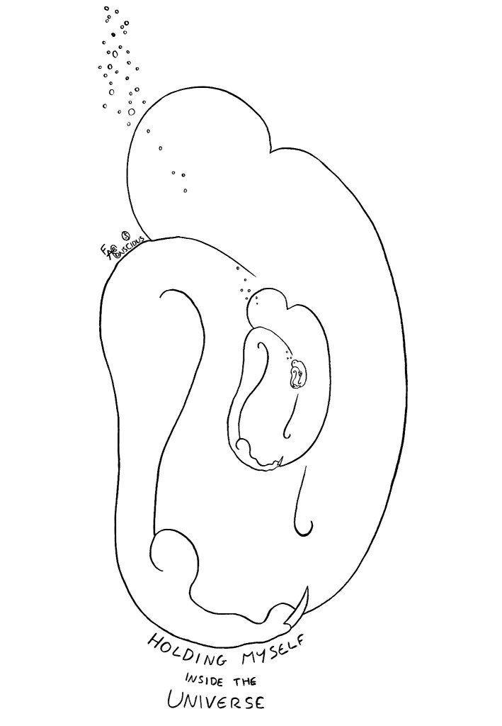 I thought about what it would feel like to be connected to the universe, as it, and I thought about how the universe is inside me, therefore I am inside me, and inside myself, so I gave myself an inside cuddle.