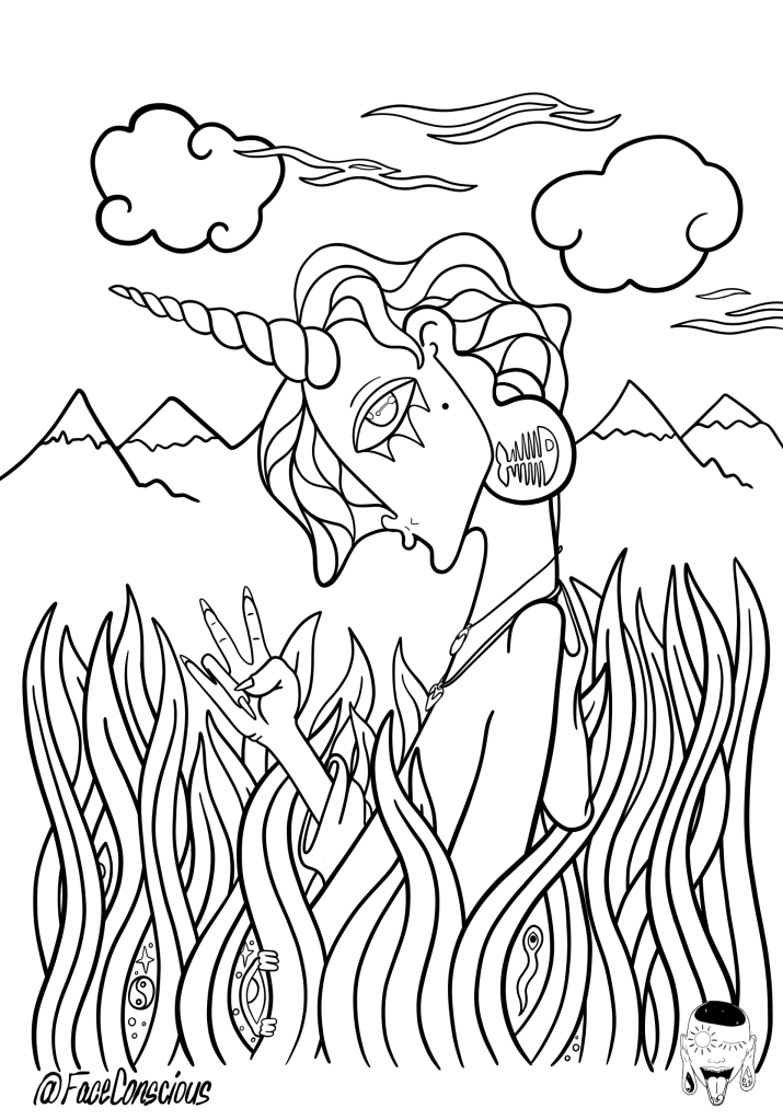 Lately I have stumbled into constantly drawing Unicorn People. Evolving from inter-dimensional beings I’ve drawn, as if those beings stumbled upon their world and ours and made a link. Unicorn People show multiple expressions of the third eye; one large eye, and the horn symbolising the spiralling of energy in and out of the third eye. The horn is also a representation of healing energy, as it is with the Unicorn, giving me the sense of harmony in this world. I notice curiosity is the driving force of this place, mimicking my own curiosity to discover it.
